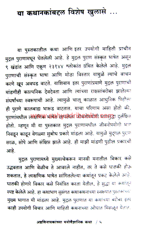 This book contains stories of Ashtavinayaka and related useful information taken from the Mudgal Purana. The setting of the Mudgala Purana is in the form of battles between fictional gods and their demons. In this Ashtavinayakanchya Manovaigyanik Katha book, the stories of Ashtavinayaka are presented in a concise and psychologically understandable manner by the author K. B. Paranjape, based on selected verses from the Mudgal Purana.