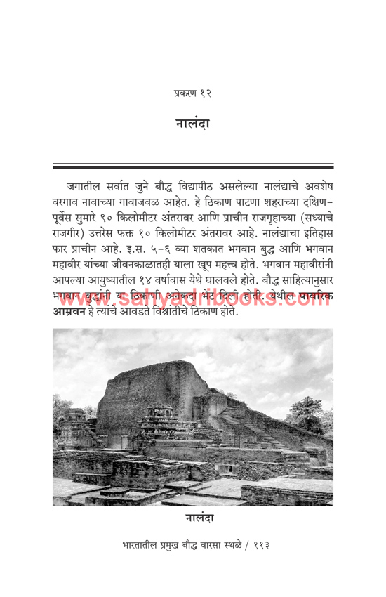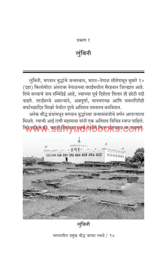 Buddhism emerged in India. The places chosen by the Tathagata between the birth of Siddhartha Gautam and the Mahaparinirvana of the Tathagata Samyaka Sambodhi are important for all Buddhist followers. How were all these places during the Buddhist era and how are they today? Preserving the heritage and wealth of Buddhist philosophy and Dhamma, these places are pilgrimage sites for Buddhists. Kapilavastu, Sarnath, Bodh Gaya, Vaishali, Lumbini, Sravasti, Kushinagar, along with a detailed review of modern-day Buddhist pilgrimage sites is given in the Bharatatil Pramukh Bauddha WarsaSthale book written by Dr. Dhammapal Mashalkar.