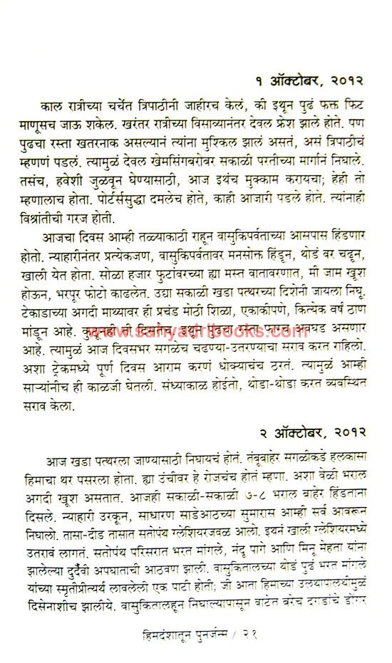 Himdanshatun Punarjanam is an autobiography written by Kavita Nirgudkar, based on her husband Prakash Nirgudkar’s experience with frostbite in Himalaya range and the treatment he received for it.