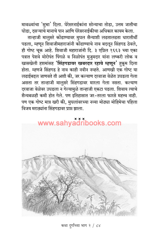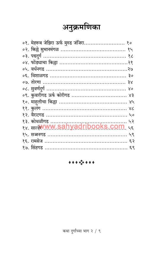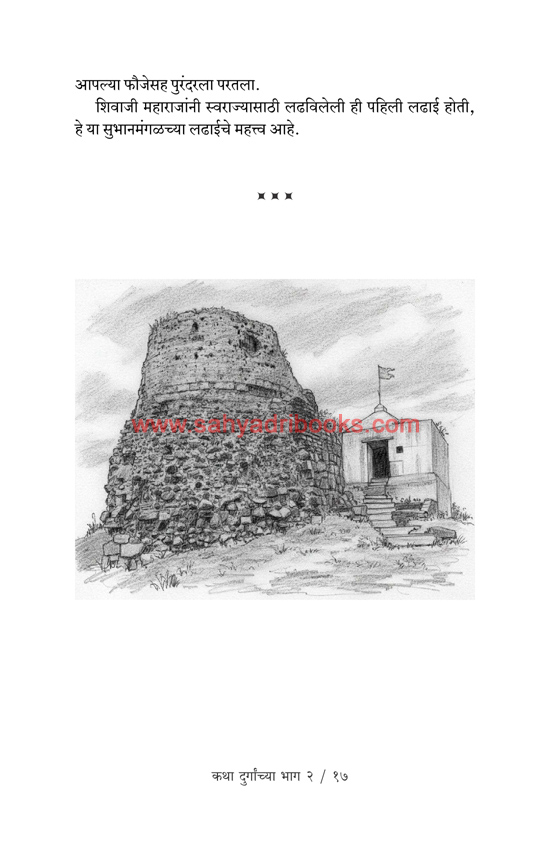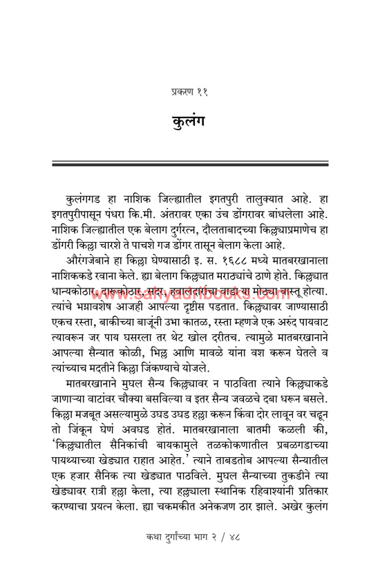 The stories related to the forts of Murud Janjira, Fort Subhanmangal, Padmadurg, Fondyacha Fort, Vardhangad, Vishalgad, Torna, Suvarnadurg, Korigad, Mahulicha Fort, Kulang, Vairatgad, Kothaligad, Salher, Sajjangad, Ramsej, and Sinhagad have been given by historian Mahesh Tendulkar in the book, Katha Durganchya Bhag 2.