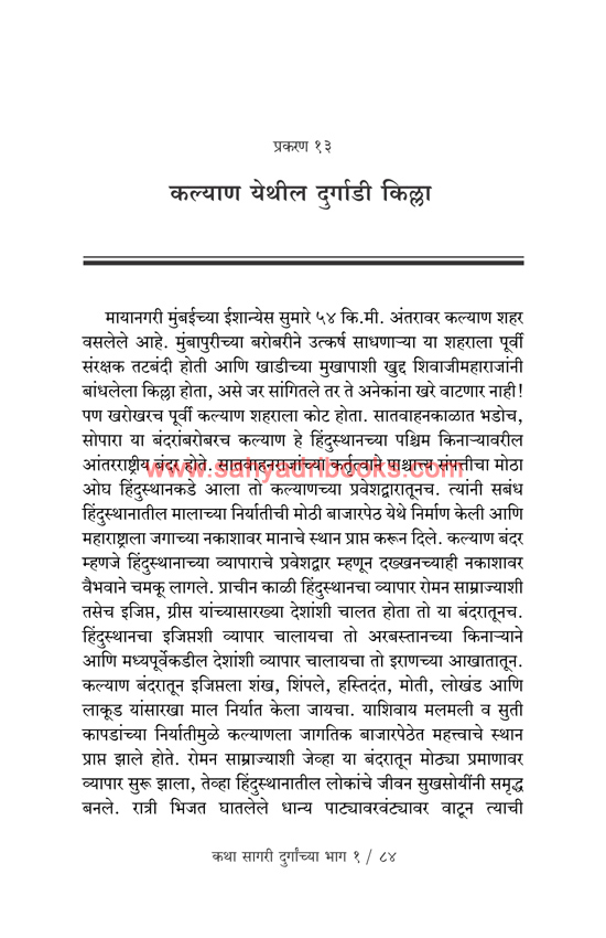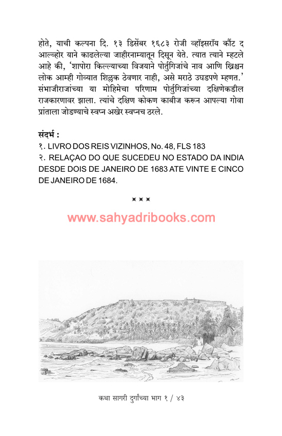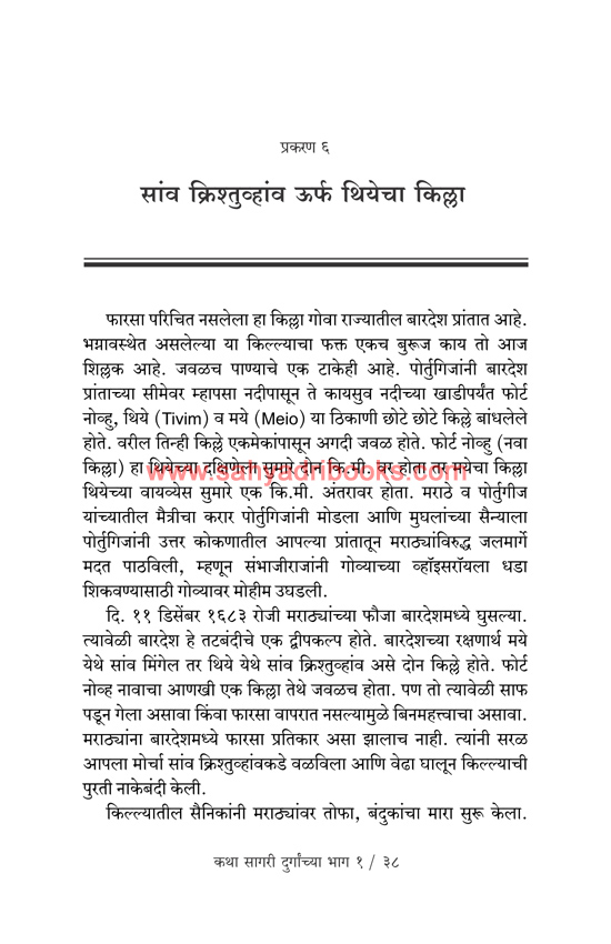 The stories related to the sea forts of Sindhudurg, Janjira, Samrajgad, Underi, Khanderi, Sanv Ishtevhan aka St. Stephen’s Fort, Thiye’s Fort, Shapora aka Kaysuv’s Fort, Janjira of Anjdiv, Kasha’s Fort, Vijaydurg, Pankot of Alibaug, Durgadi have been given by historian Mahesh Tendulkar in the book, Katha Sagari Durganchya Bhag 1.