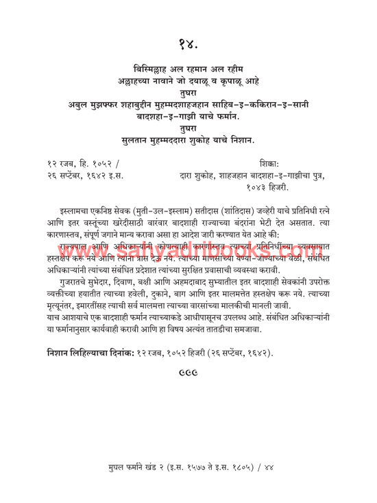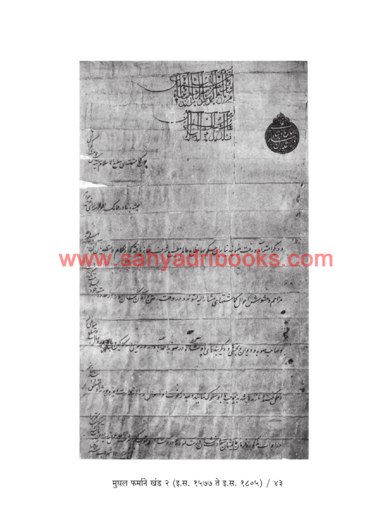 Mughal Farmane Khand 2 (1577 AD to 1805 AD) (Marathi Translation of Original Persian Documents by Guruprasad Kanitkar This book presents the ‘Royal Decrees’ (*Shahi Farmans*) along with their Marathi translations, that the Mughal Emperors Akbar, Jahangir, Shah Jahan, and Aurangzeb issued from time to time to Shanti Das Jhaveri, the renowned jeweler and *Nagarseth* (Chief Merchant) of Ahmedabad.