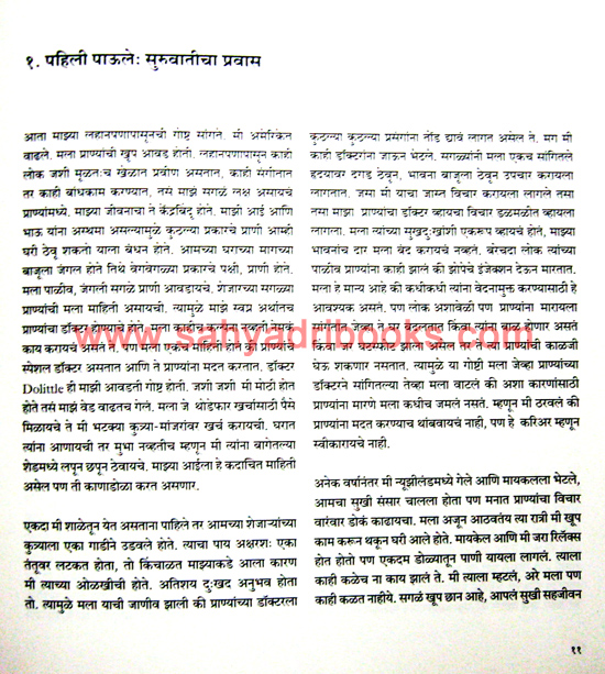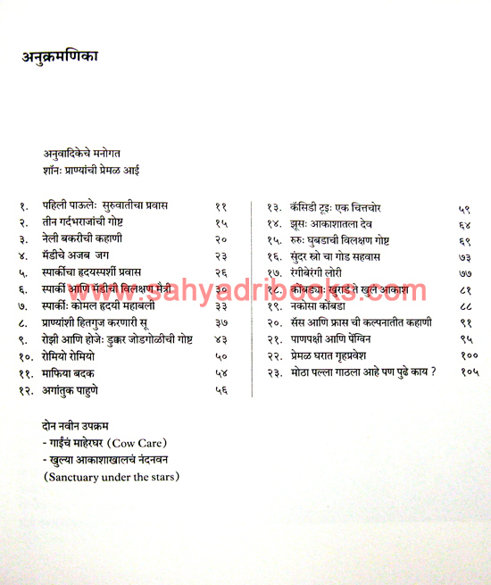 The original English book is written by Sean Bishop, and the Marathi translation, titled New Zealandcha Abhayashram, is done by Dr. Mohini Vidwans. It describes a sanctuary in New Zealand for neglected animals, which Sean and Michael established in 2002 after leaving their high-paying jobs. This is the story of animals who came to the sanctuary and lived the rest of their lives happily, bringing immense joy to everyone they met.