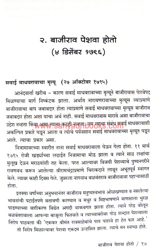This is the biography of the Bajirao Peshwa II. The formation of the character of the second Bajirao Peshwa, the power, he received in an unimaginable way, the indiscriminate use of that power, the treaty he made with the British. His last war of independence, his life course in Brahmavarta and finally his death, have been described coherently in the Peshwa Dusra Bajirao book by the author Prof. S.S. Puranik.