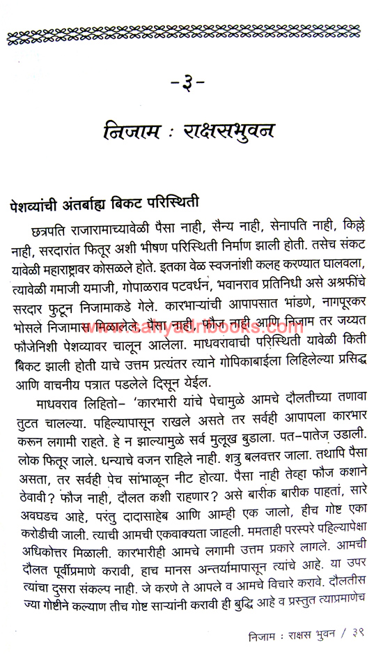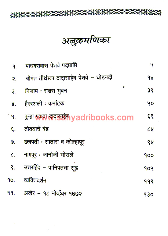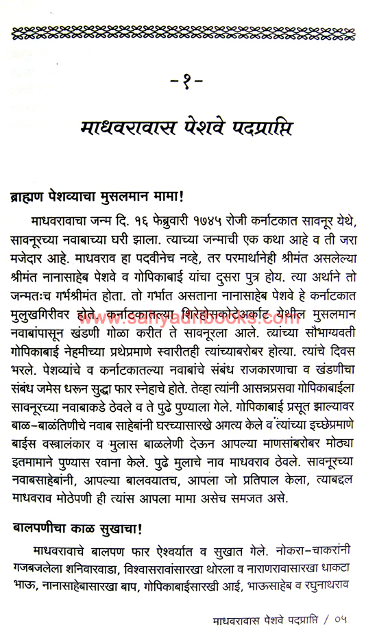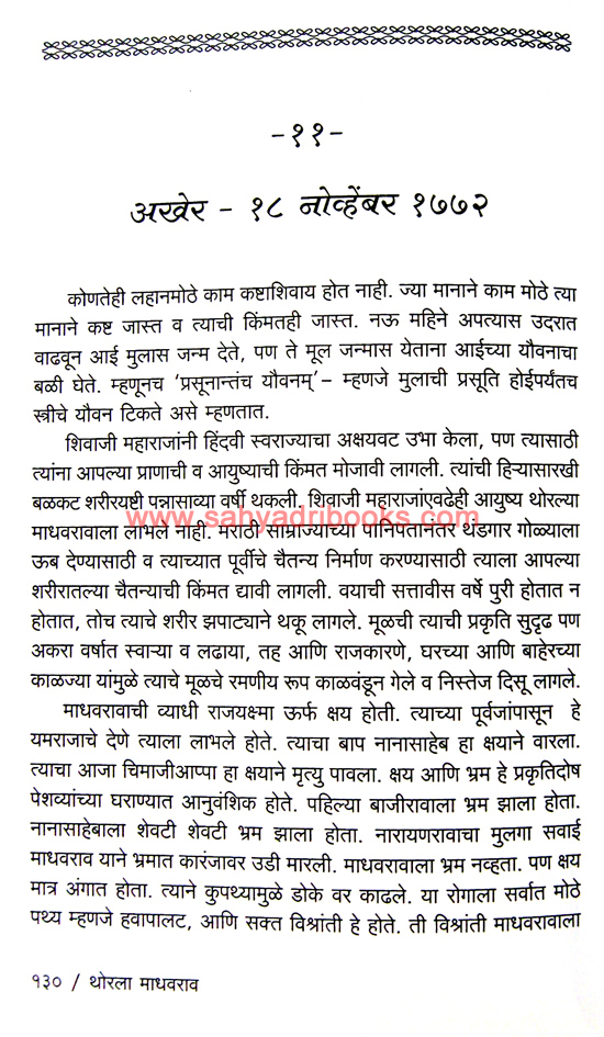 It describes the immense challenges he faced after assuming power at the age of sixteen after the Battle of Panipat and his successful efforts to restore the strength and prestige of the Peshwa in eleven years. In the book Peshwa Thorla Madhavrao, author Prof. S.S. Puranik has described in detail the great leadership, bravery, diplomacy and character of Madhavrao Peshwa.