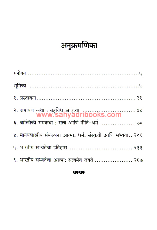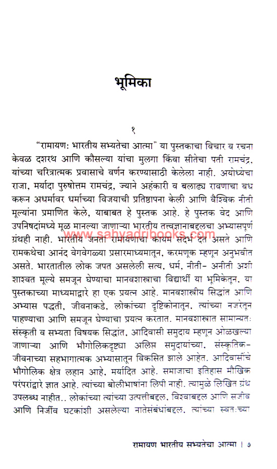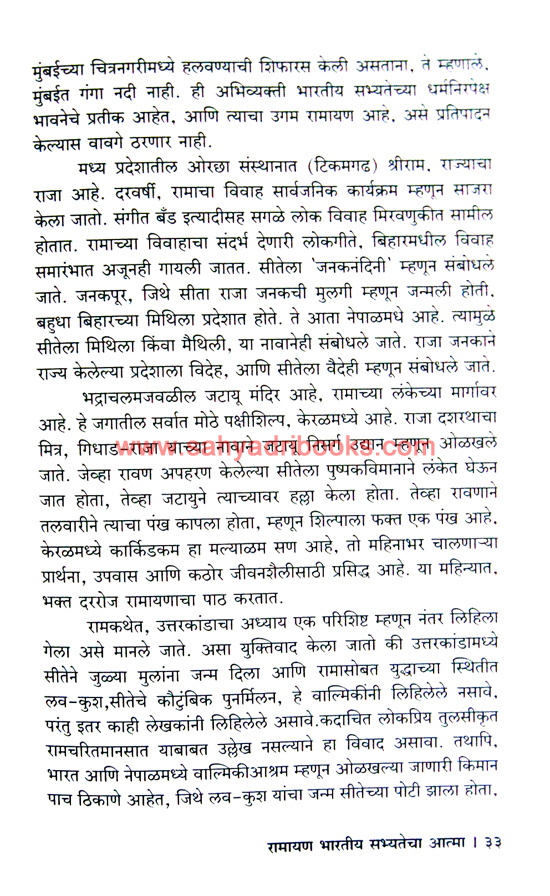 Author Ramchandra Mutatkar in this Ramayan Bharatiya Sabhyatecha Atma book attempts to provide a holistic and integrated view of the eternal human values of truth, religion, renunciation, and compassion. The Ramayana brings together urban, rural and tribal areas, and agricultural societies with food-gathering forest-dwelling societies. This book attempts to anthropologically analyze the history of India as a source of Indian spiritual values and Indian civilization from the perspective of ordinary people spread across all geographical regions.